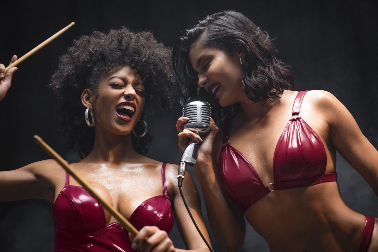 Two-piece vinyl set in an iconic color. Includes bralette with ring details and matching thong.
