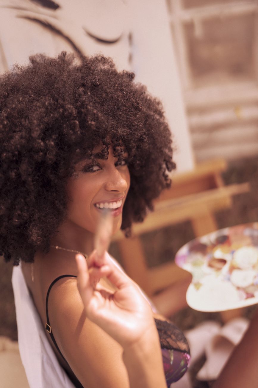 Emerging from a secret garden among lush flowers. Two-piece set in printed mesh with eyelash lace trims. Features top with adjustable straps and matching panty with back lace-up design.